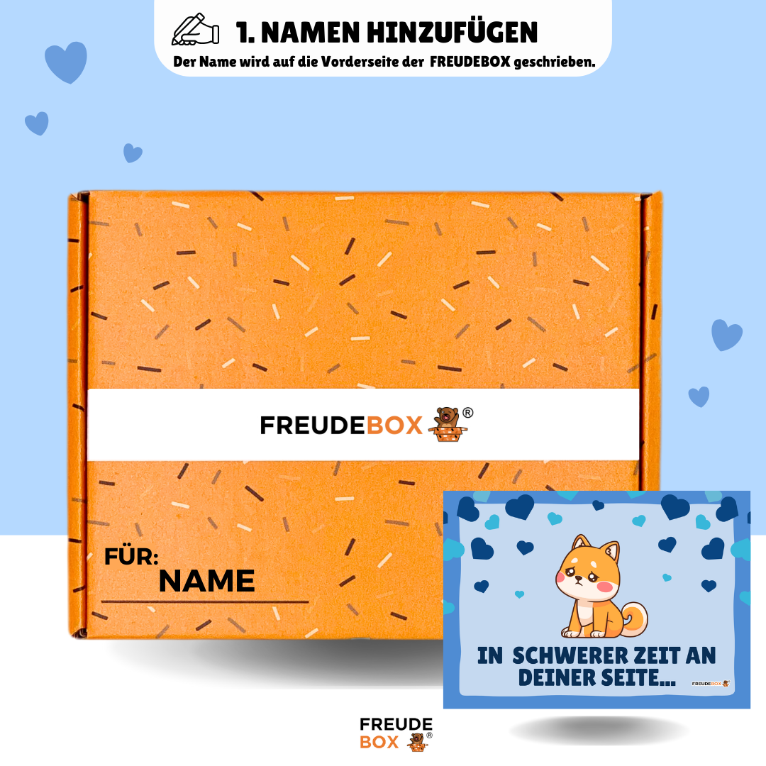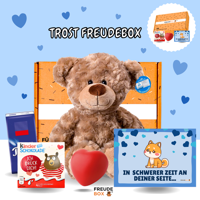 Jemand, den du liebst, macht gerade eine richtig schwere Zeit durch? Du möchtest zeigen: Ich bin für dich da auch wenn du nicht persönlich vor Ort sein kannst? Dann ist unsere Trost FREUDEBOX genau das Richtige.