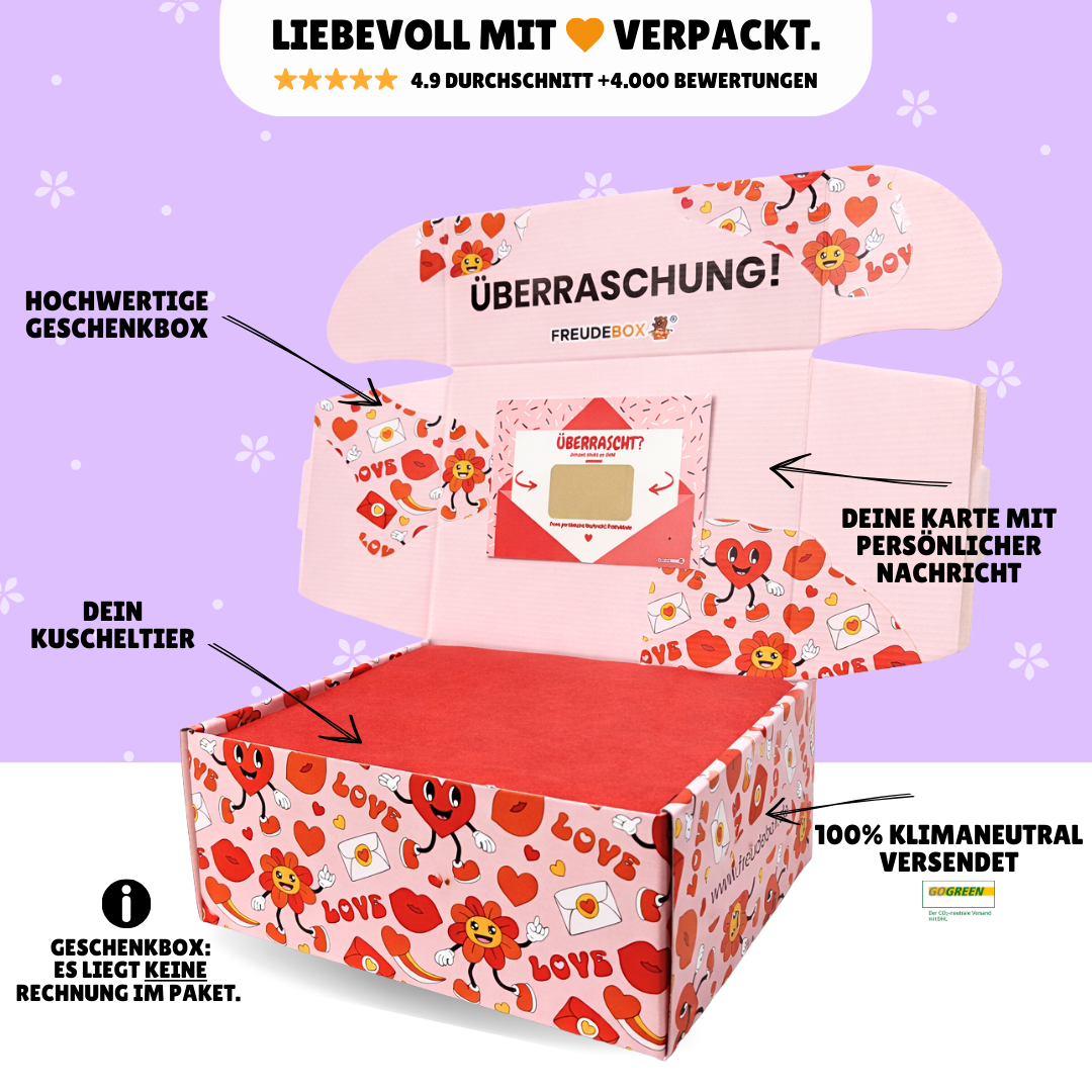 Lieferumfang: Stofftier + personalisierte FREUDEBOX-Geschenkbox + Überraschungskarte