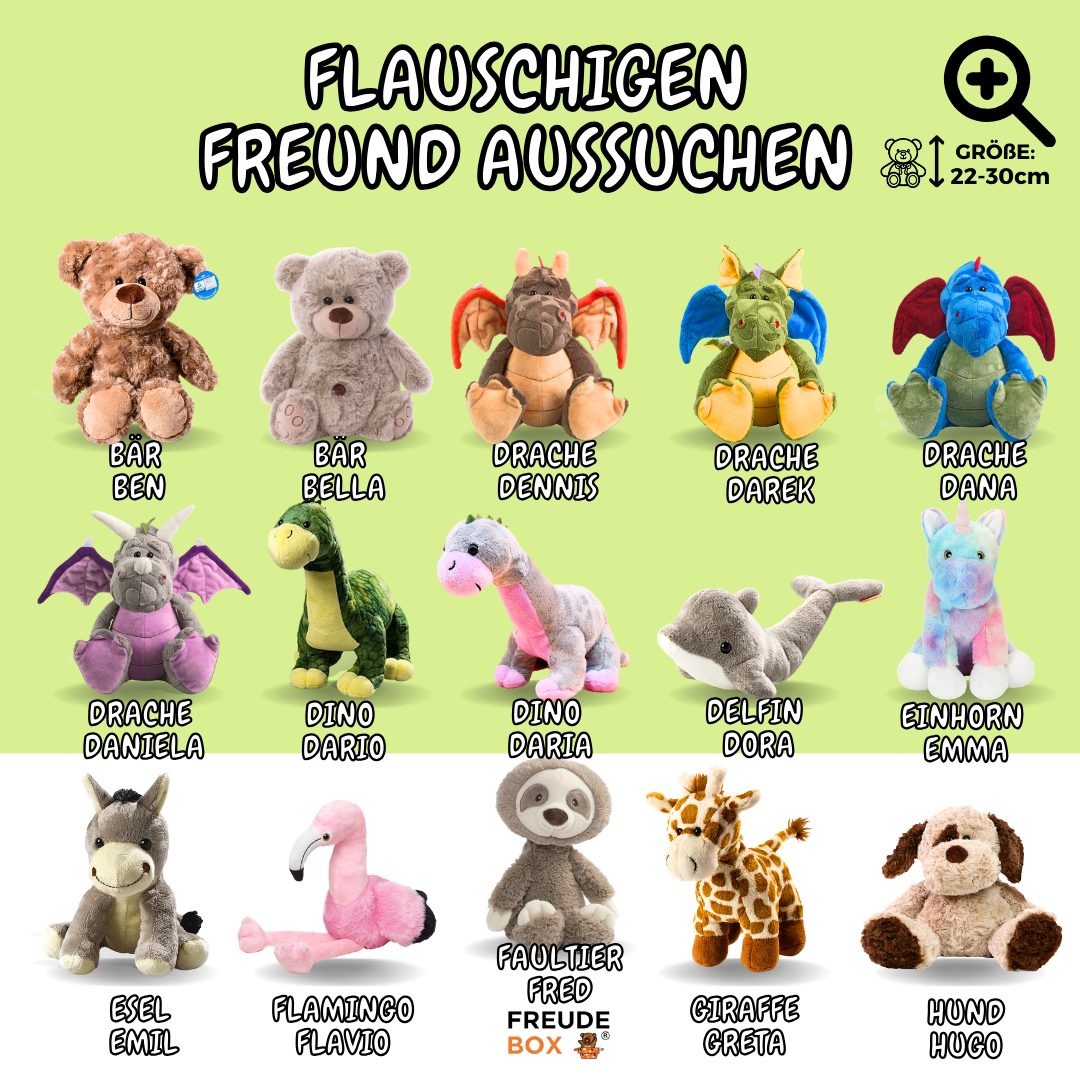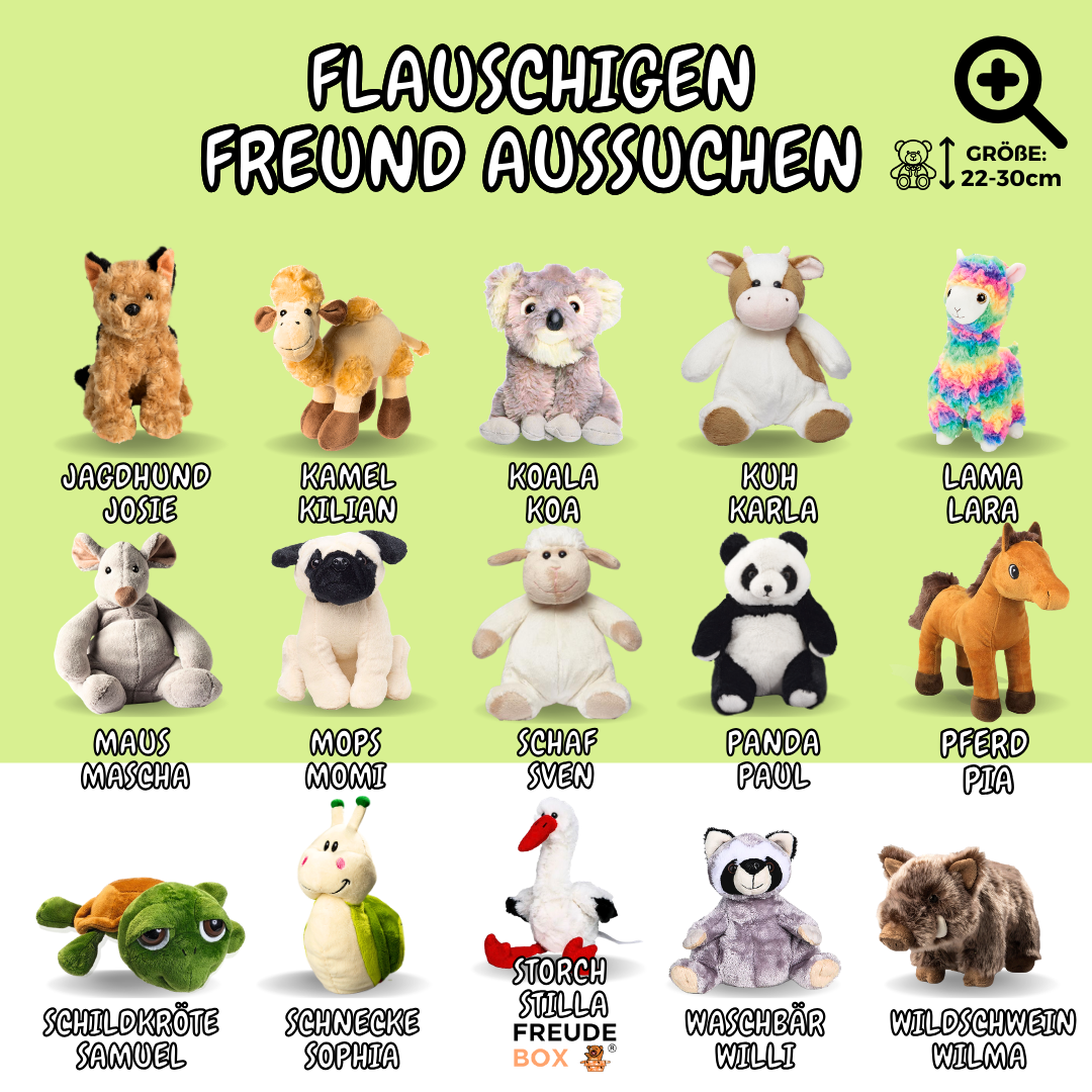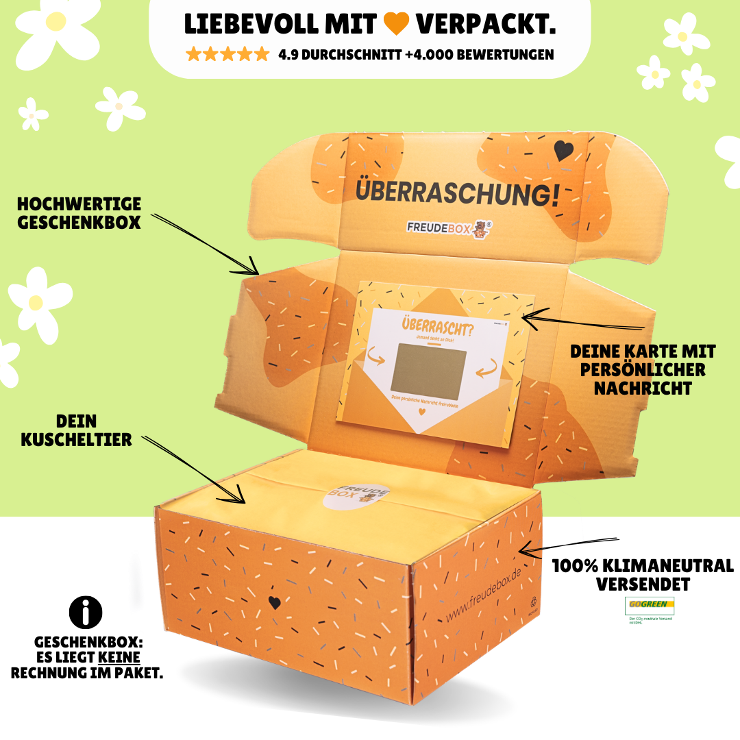 Lieferumfang: Stofftier + personalisierte FREUDEBOX-Geschenkbox + Überraschungskarte