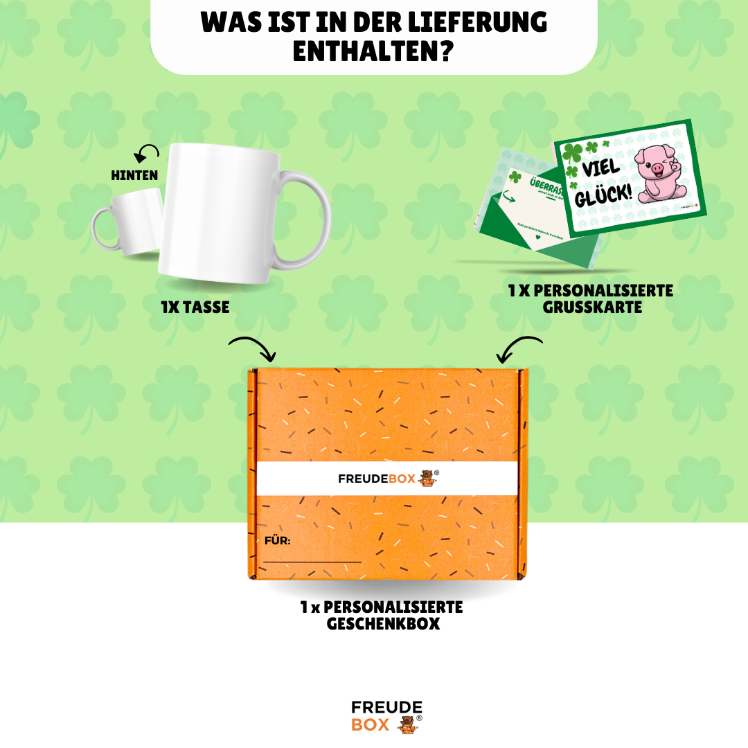 Das Viel Glück Foto-Tassen-Bundle von FREUDEBOX ist das ideale Geschenk, um einem besonderen Menschen deine Zuneigung zu zeigen. Die Box enthält eine Tasse mit deinem Foto & eine liebevoll gestaltete Grußkarte mit deiner persönlichen Nachricht.