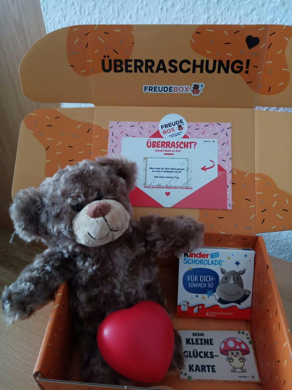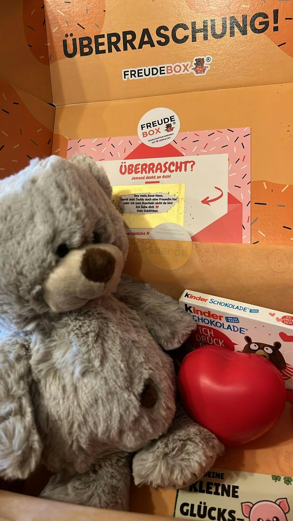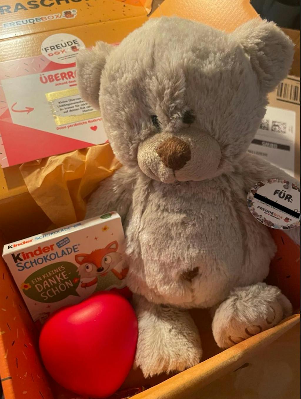 Ich habe eine Freudebox für meinen Freund bestellt und bin absolut begeistert! 💝 Der Teddy ist super süß, die Verpackung liebevoll gestaltet und alles kam schnell und sicher an. Man merkt richtig, wie viel Herz in dem kleinen Unternehmen steckt. Eine wunderschöne Idee zum Verschenken – ich kann es nur weiterempfehlen! 🧸✨